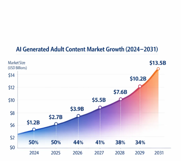 The AI adult segment is projected to grow at a CAGR of 35% – 40%, significantly outstanding both traditional adult content and many SaaS categories.